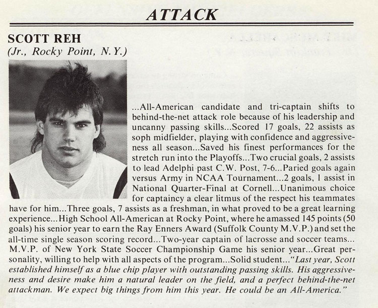 Reh stayed local and went to Adelphi from 1985-1989. He was the school’s first two-time captain and led the team to a No. 3 ranking in the nation when it was still competing at the Division I level.